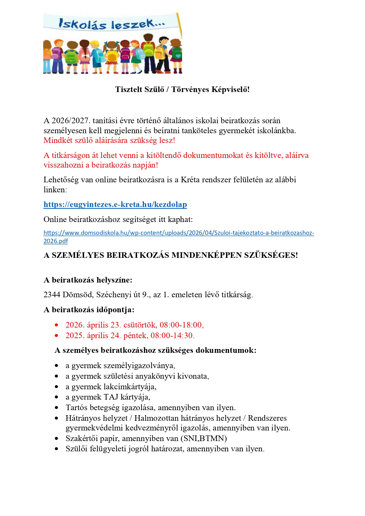 Szülői tájékoztató beiratkozáshoz 2026 2026. ápr 7 A beiratkozáshoz szükséges tájékoztatót ide kattintva olvashatják